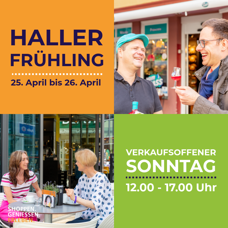 Der Haller Frühling ist mit einem bunten Programm, vielen Aktionen und tollen Events über die Stadtgrenzen hinaus bekannt. Auf Besucherinnen und Besucher wartet ein abwechslungsreiches Wochenende für Groß und Klein. Am verkaufsoffenen Sonntag öffnen die Geschäfte in der Innenstadt und in den Handelszentren die Türen von 12.00 bis 17.00 Uhr.