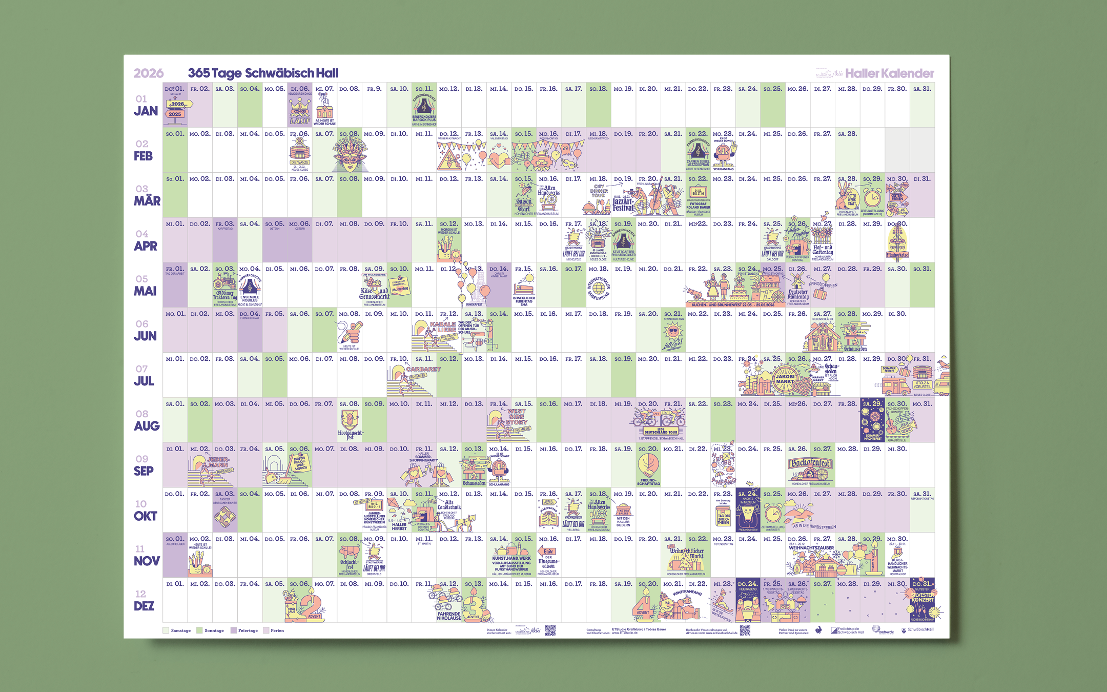 Wann ist eigentlich was in Schwäbisch Hall? Der Haller Kalender liefert eine Übersicht über 365 Tage Schwäbisch Hall. Der Kalender enthält nicht nur eine Übersicht über das Jahr 2026, sondern auch alle Termine der Stadt, den Freilichtspielen, den Siedern, dem Freilandmuseum und natürlich von Schwäbisch Hall aktiv e.V.. Außerdem sind auch alle Ferien und bewegliche Ferientage in Schwäbisch Hall sowie die Feiertage abgebildet.