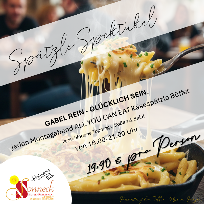 Vergiss den Montags-Stress und komm zum ultimativen Soulfood-Abend. Wir feiern das goldgelbe Glück in der Pfanne bei unserem Käsespätzle Buffet!